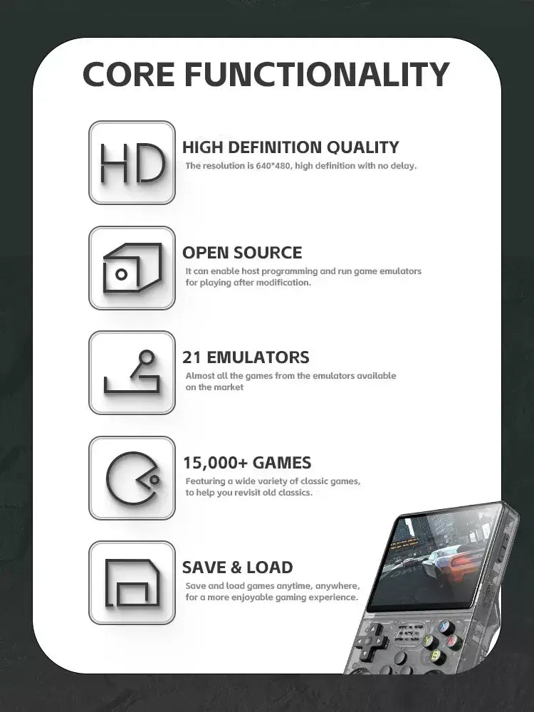 The R36S Retro Handheld Game Console offers over 15,000 classic games from legendary emulators like NES, SNES, N64, and more. Its sleek design, 3.5-inch IPS display, and powerful RK3326 CPU provide an immersive gaming experience.